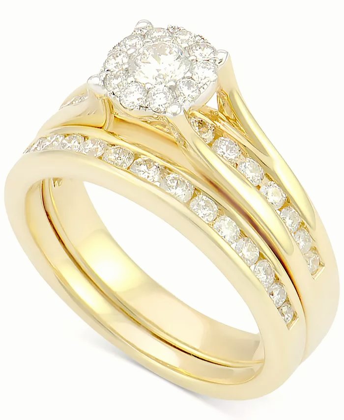It’s all about the elegance with this romantic round-cut diamond bridal set (1 ct. t.w.) featuring a stunning engagement ring and matching wedding band adorned with channel-set diamonds. Crafted of 14k white, yellow or rose gold.