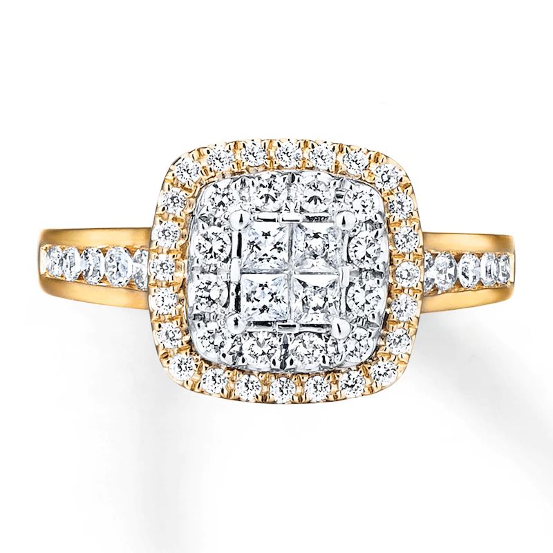 Framed by two rows of round diamonds, four princess-cut diamonds sparkle together in this beautiful engagement ring. The 14K yellow gold band glitters with channel-set round diamonds, bringing the total diamond weight to 3/4 carat. The center diamonds are set in 14K white gold.
