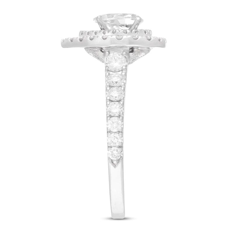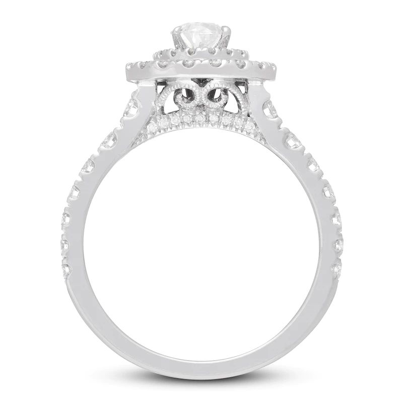 Collection comes this enchanting women’s engagement ring. The ring features a stunning pear-shaped diamond at its center, haloed by two rows of brilliant round diamonds. Additional round diamonds grace each side of the band, bringing the total diamond weight to 1 3/8 carats.The ring is fashioned in 14K white gold.