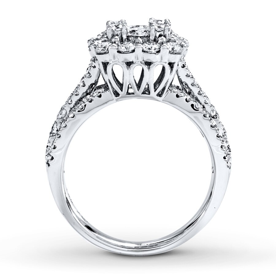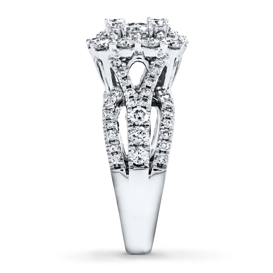 A bouquet of round diamonds blooms at the center of this fabulous engagement ring for her, styled in 14K white gold. Ribbons of round diamonds weave along the band, bringing the total diamond weight to 2 carats. Available online while supplies last. Previously Owned Treasures are not eligible for in-store pickup. Previously Owned Treasures may only be shipped either to your home address or to an alternate address.